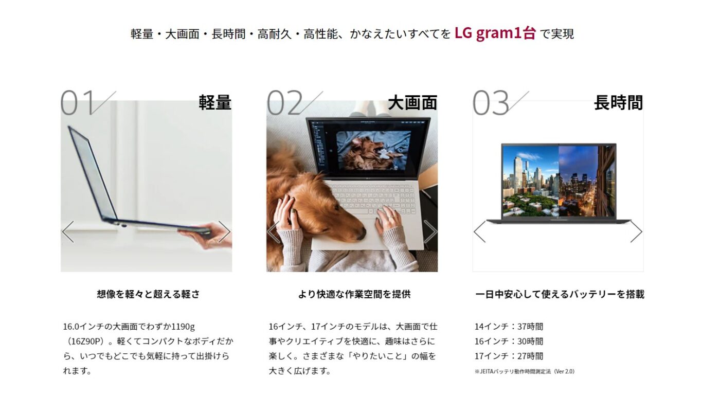 第3位はLGのgramシリーズです。このノートPCはかなりCMにも力を入れていたりしていたので知っている方もね結構多いと思います。